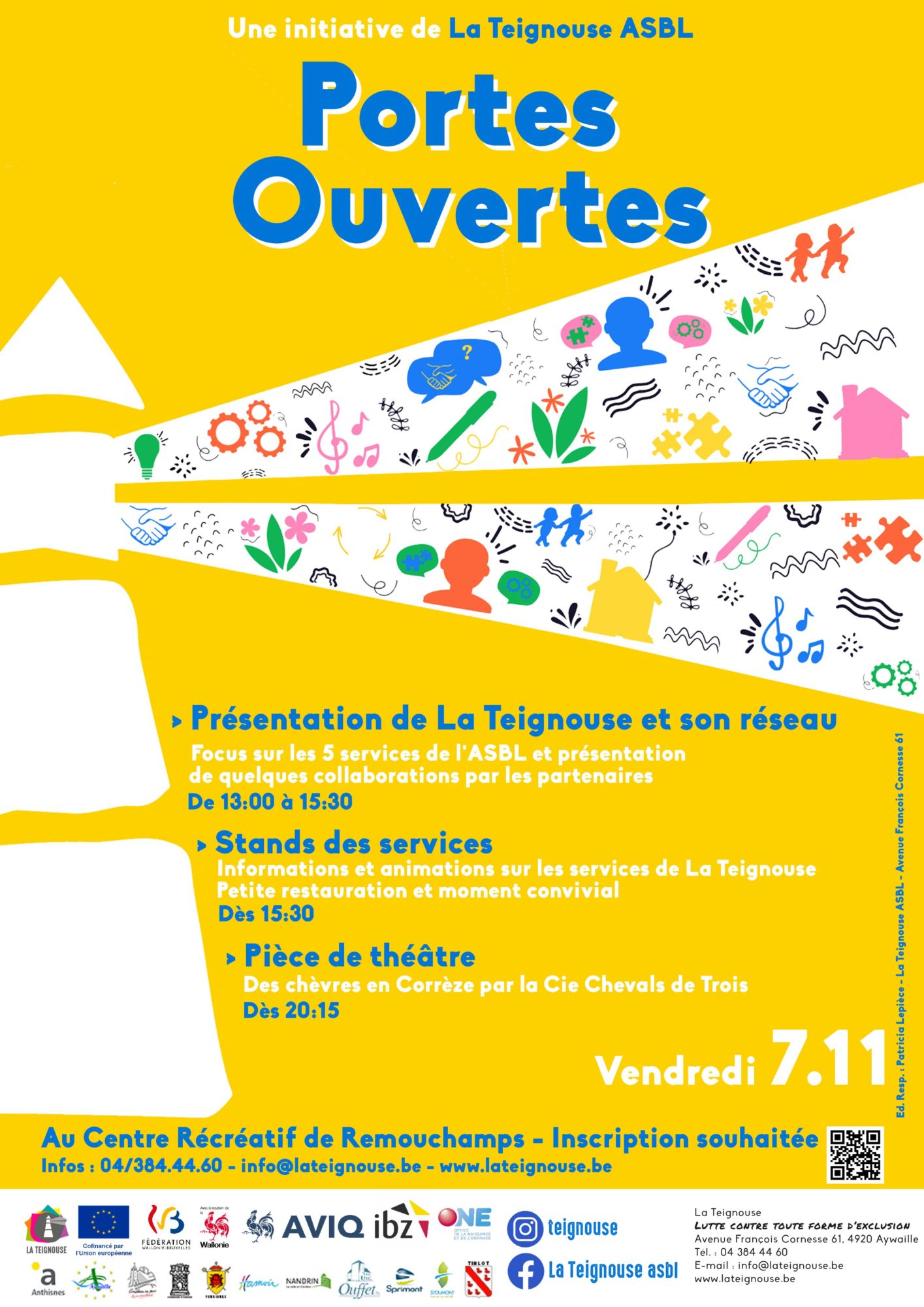 Invitons portes ouvertes de la Teignouse ASBL, le vendredi 7 novembre au centre récréatif de Remouchamps. La porte ouverte se déroulent en continu.